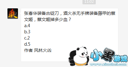 张春华装备古锭刀,酒火杀无手牌装备藤甲的蔡文姬,蔡文姬掉多少血?2月17日的三国杀问答的题目来了,今日的题目有些难度,很多小伙伴不知道题目的答案,不过没有关系,小编已经为大家准备好了答案,不知道答案的小伙伴可以到我爱秘籍网进行查看。
