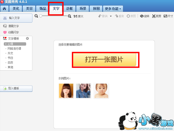 3、小编使用的是美图秀秀,打开之后选择一张图片,并且使用文字!