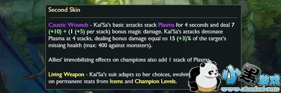 凯纱的基础攻击敌人叠加等离子标记层数持续4秒,并造成额外的 [(7-12) + 10 % AP] + ([(1-9) + 5% AP] 每层)魔法伤害。