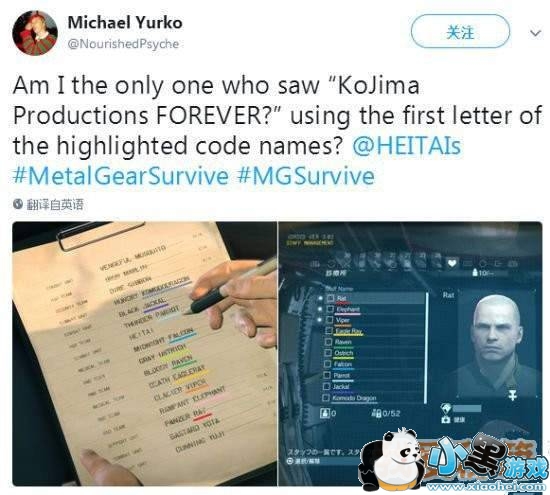 玩家Michael Yurko在《合金装备:幸存》开头填名字的名单上发现了一个彩蛋,名单上以藏头的形式隐藏了“KJP FOREVER”这句话,KJP也就是Kojima Productions——小岛工作室 FOREVER。