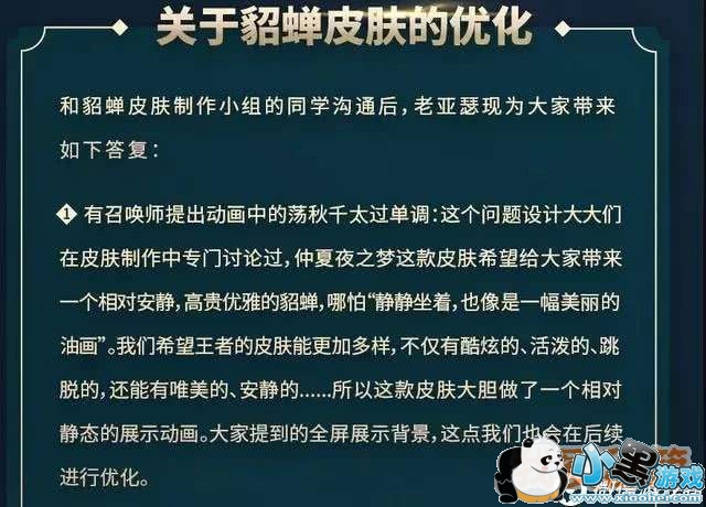 首先是貂蝉传说级皮肤仲夏夜之梦的优化反馈回答,有网友称这款皮肤出场画面只有荡秋千太单调。