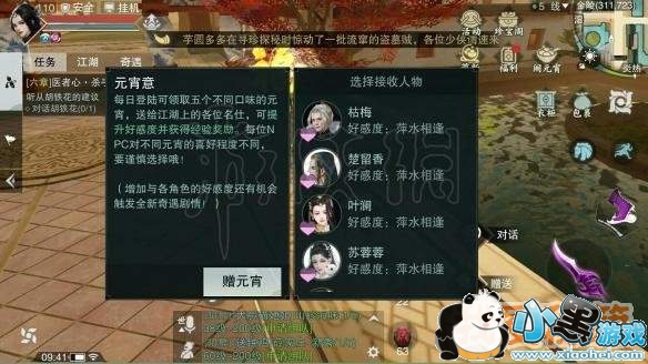 元宵可以增加好感度,最高加400,各种口味元宵每天领一次,可选npc比元宵数目要多,大家可以自行选择送给谁。