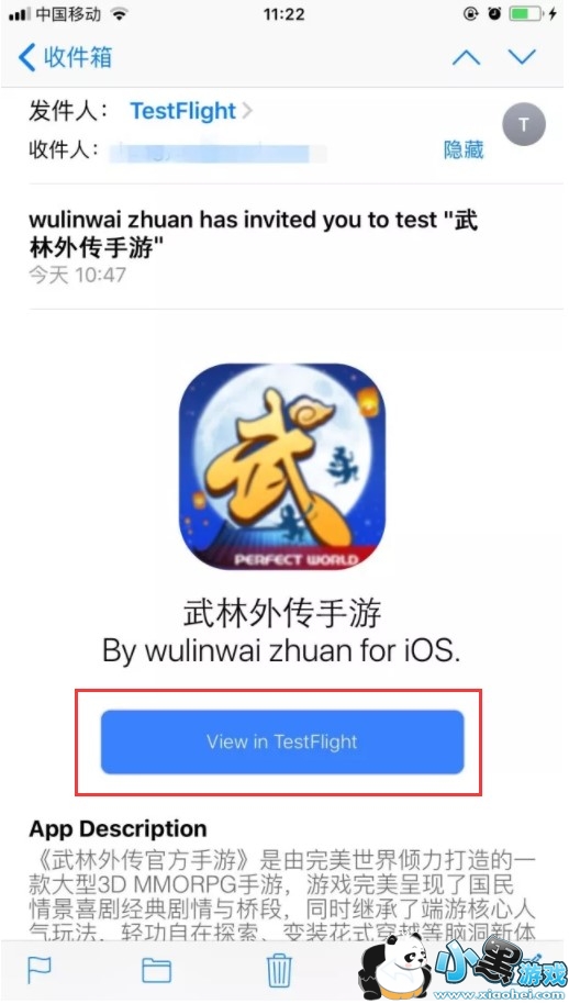使用手机打开预约游戏时填写的邮箱,在邮箱中查看发件人为“TestFlight”的通知邮件,点开邮件后点击“View inTestFlight”跳转至《武林外传官方手游》客户端下载界面。