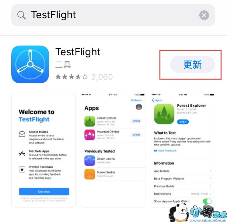 注:如已经安装过,请保证您的TestFlight更新到最新版本,可在苹果应用商店搜索“TestFlight”,点击“更新”按钮进行更新。