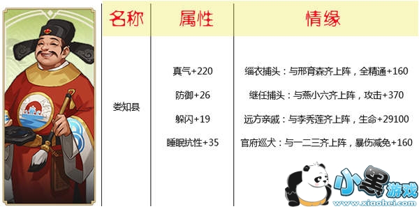 | 生命+1280 真气+220 暴击+19 眩晕抗性+35 | 巡街拍档:与燕小六齐上阵,生命+29100 县衙忠犬:与娄知县上阵,命中+2930 命绝双煞:与郭芙蓉齐上阵,爆抗+2930 衙门同僚:与邢育森齐上阵,全抗性+160 |