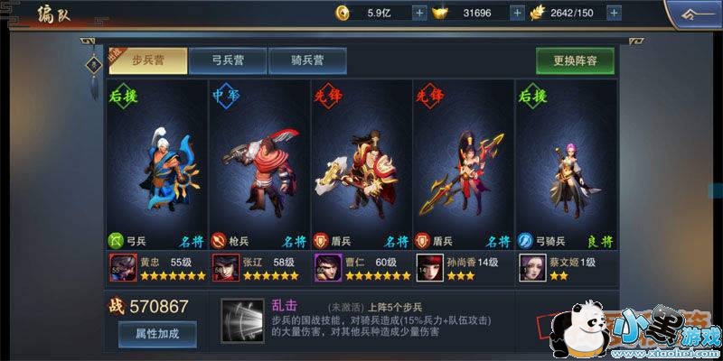 在步兵营阵容中保护后排的输出尤为重要,只有扛得住伤害才能更好的输出。既然是以保护为主的阵容,那么先锋曹仁和后援蔡文姬自然是必不可少,不管是遇到血厚的前排还是后排输出兵,都能第一时间顶在前面吸收敌方对后排队友的伤害。后援武将黄忠,超高的伤害,超远的射程,造成巨额伤害的同时又能站住脚跟,持续输出。先锋孙尚香和中军张辽具有远程的范围伤害,不仅可以对残血的敌方后排兵有斩杀作用,还可以对侧翼的敌军进行攻击和击杀。总得来说就是一套曹仁+黄忠+蔡文姬+张辽+孙尚香的阵容。