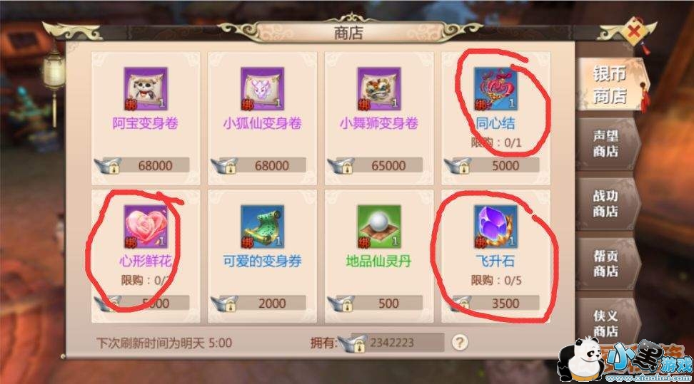 例如银币商城的同心结、心形鲜花、凝形丹、飞升石、道行符、稻草人……想要的每天都不放过……
