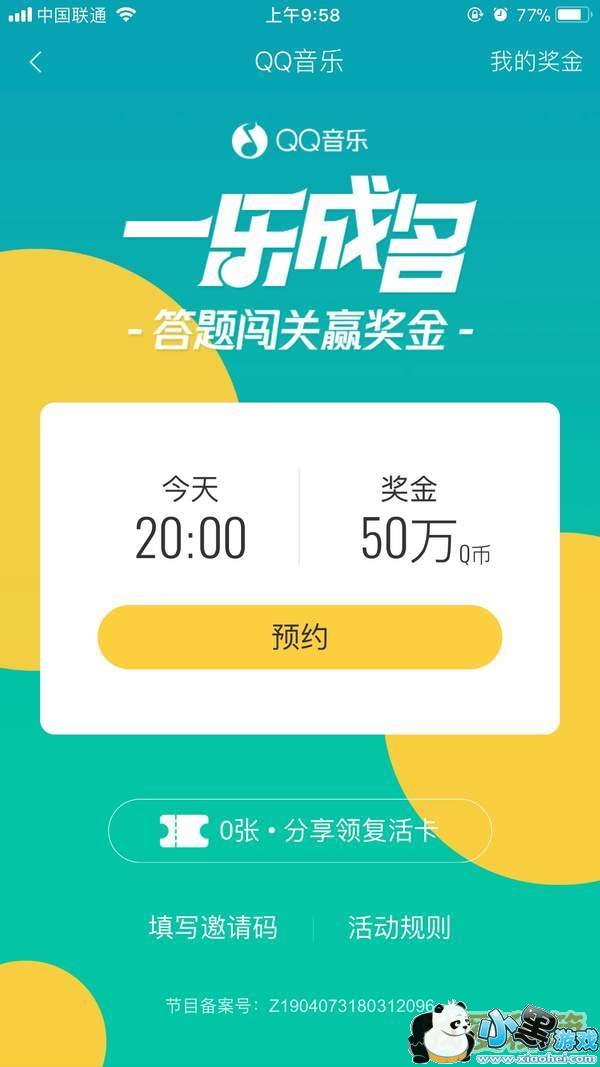 QQ音乐《一乐成名》在每周三、五晚上的20:00准时开启,持续约半小时,每场一共12个问题,奖金以Q币形式发放,单场奖金在10万左右。