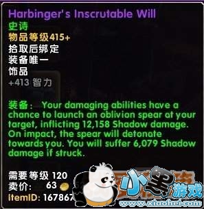 装备:如果你的目标血量百分比比你的低,你的伤害性法术和技能有几率献祭你1606生命值,然后对目标额外造成3211暗影伤害。
