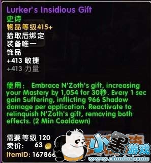 使用:拥抱恩佐斯的礼物,增加你的精通1054点持续30秒。每秒获得痛苦,造成966暗夜伤害。再次使用放弃恩佐斯的礼物,失去两种效果。