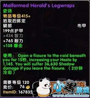 使用:在你身下打开虚空的裂缝持续15秒,增加你的急速1145点。如果你离开了裂缝会收到36630暗影伤害。(2分钟CD)