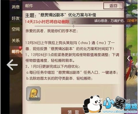 今天更新了内容优化,每日任务增加了悬赏缉凶任务入口,一键进本,去除地图过长的防御副本,提供金判产出,能够让玩家轻松搬砖,还能够提高炎峰地图冒险图的绑定金判产出,还会在更新之前每天通关邮件为账号发放20W绑定金判作为补偿。