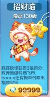 招财喵:bonus有概率会召唤长脚大金币,踩弹簧会爆金币多人对战模式下,金币和长脚金币能带来高能量。