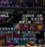 如同他的名字,是只有英雄才能使用的药水。想要获得也不是简单的一件事。在西海岸的东边,有一座死亡之塔,只有通过那里,获得死神对你的认可,莎兰才会将此物品交给你。他的效果也是很强大的。在200S内力量与智力各加60,相当于全程了。