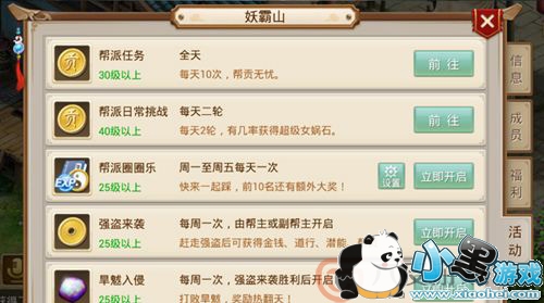 ①只有中级帮派才能开启(初级帮派15人、中级帮派30人、高级帮派40人、顶级帮派50人)。