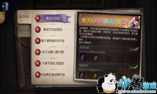 这一次复活节活动也可谓是良心的一批,不仅送的礼物一大推,任务也是异常的简单,今天的任务小编可是全部都完成了哦,这一次的复活节任务中就有许多豹子头零充最喜欢的非酋快乐石,而且任务也是很简单,只需要在线半小时即可领取,另外,其他的任务也是需要玩家通过游戏对局来获得复活节彩蛋,至于复活节彩蛋有什么用呢?小编会在下面跟大家好好解答,值得一提的是,这一次的任务持续时间是5天哦,同时任务是可以累积的,所以小伙伴们不用担心任务会过期完成不了啦!