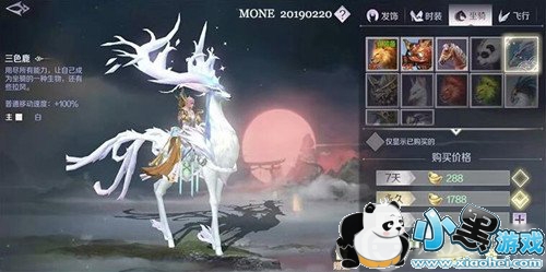 三色鹿这个坐骑的颜值可以说是杠杠的,高贵优雅的造型受到很多女性玩家的喜爱,价格虽然也是1788元宝,但是三色鹿坐骑的移动速度加成有100%,还是比较高的。