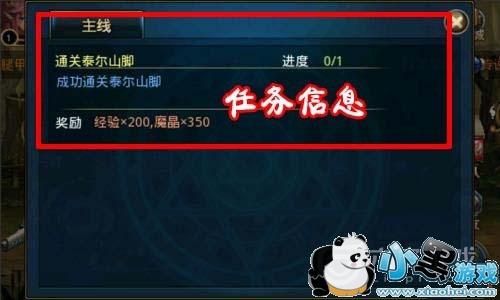 在我们的时空猎人主线任务界面中,可以清楚的看到需要通关这个任务,我们要:通关泰尔山脚,获得奖励:经验×200,魔晶×350。