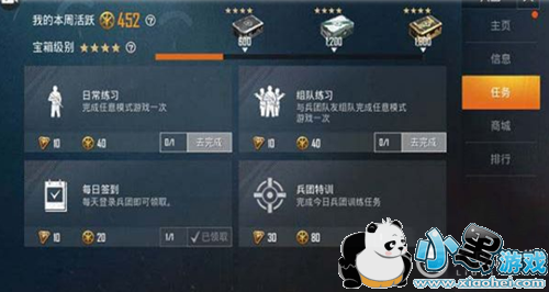 3.兵团活跃宝箱,每周完成兵团任务就能够得到兵团活跃度,当玩家活跃度到了600/1200/1800就能够领取宝箱了,这个是每周刷新的。