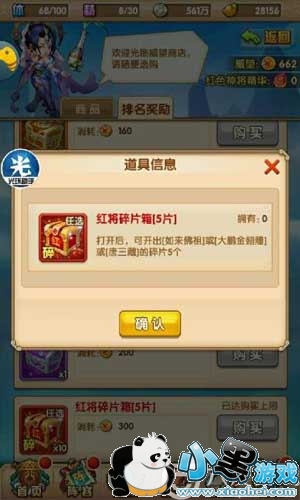 在竞技场打排名,按照积分生成一个排行版,根据排行榜上的排名可以领取奖励,竞技场第一一次能开出50个碎片,然后威望商店中也能用威望兑换一个红将碎片箱子,300威望一个箱子,里面有5个随机碎片。