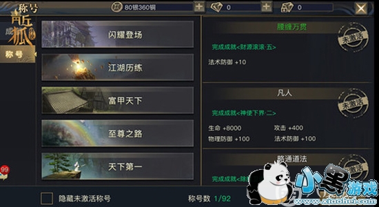 在青丘狐传说手游中称号和成就在同一个版面,只要玩家完成了相应的成就就会激活某个称号,比如完成<财源滚滚·五>,激活成就<腰缠万贯>,获得的属性加成是法术防御+10,再比如完成<神使下界·二>,激活成就<凡人>,获得生命+8270,攻击+400,物理防御+100,法术防御+100这几个属性加成。