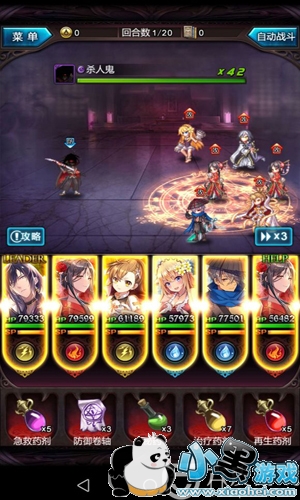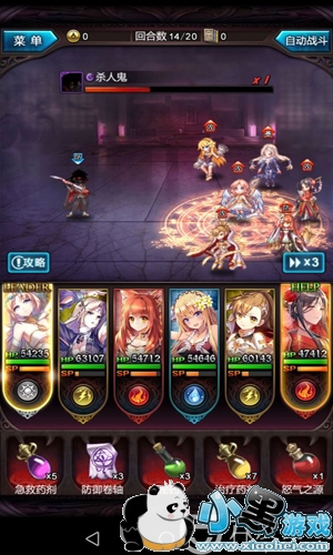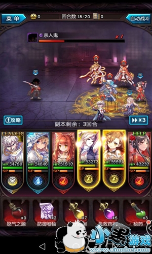 在这个关卡的boss是一个杀人鬼,游戏是这么介绍的,有援助者在场时,所有角色受到的伤害降低30%,但是御受到攻击的几率上升,杀人鬼每3回合释放一次必杀技对单体目标造成大量伤害,但是此后一回合它受到的伤害也会提高,同时杀人鬼攻击是还有概率造成防御降低以及每回合扣减生命的流血效果,总之这个boss就是一个很难缠的角色。