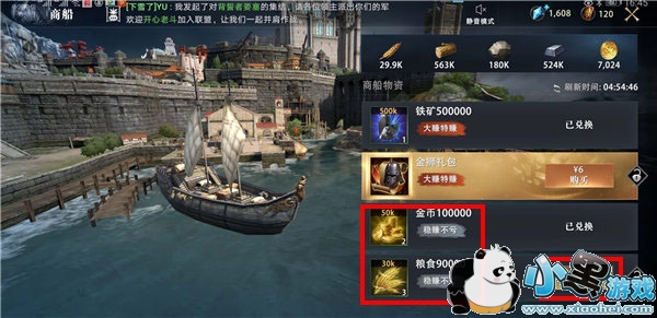 游戏中的商船每隔一段时间都会刷新兑换物品,就比如说小黑游戏小编这次看到了商船中可以兑换50K的粮食,粮食稀缺的小便当然选择了兑换。