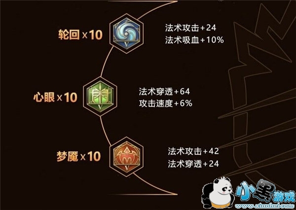 分析:10轮回提供24的法术攻击和10%的法术吸血,可以保障王昭君前期的血量续航,但是蓝量不足也得回家。10心眼提供64的法术穿透和6%的攻击速度,可以更快的触发被动3枚尖刺。10梦魇提供42的法术攻击和24的法术穿透,提高王昭君的爆发能力。
