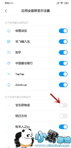 最后在自己安装的应用中,找到宝石研物语这个游戏,点击右边的开启既可以解决黑边问题。