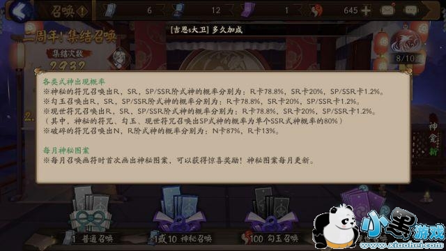 SSR、SP式神抽卡概率1.2%