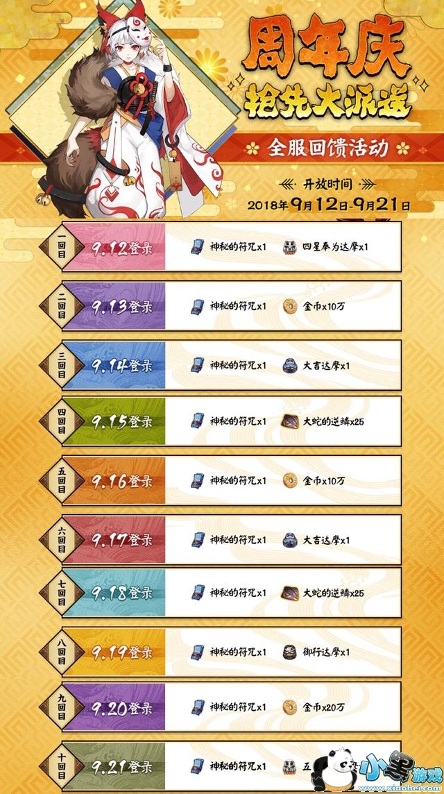 在9月12日到9月21日期间,每天只要登录游戏就可以领神秘的符咒一张以及其他奖品,9月19日登录,可以直接领到御行达摩1个。