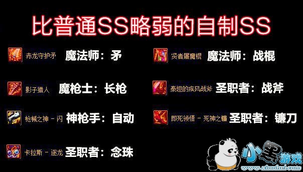 这些SS比起普通的90SS来说要弱一些,所以大家还是尽量不要选,如果实在没有武器,要选那么也无可厚非。说实话也不是这些SS弱,而是有的普通SS太强,就比如驱魔师的战斧,星际毁灭,这玩意都被称为一个职业了,还有那把镰刀灵魂剥离,这些武器太强了,所以自制SS的光芒也就相对的弱了。