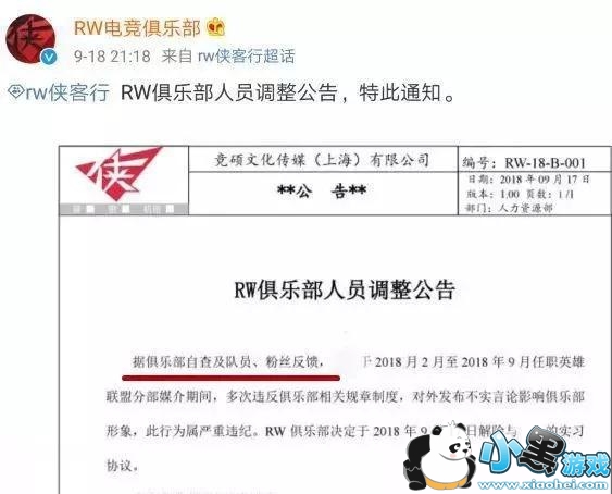 而在9月18号晚上英雄联盟RW战队官博在超话里发布公告:“经过俱乐部自查以及队员、粉丝反馈,某名工作人员在担任战队媒介的时候违反相关规章制度,对外发布不实言论影响形象,因此将她开除!”