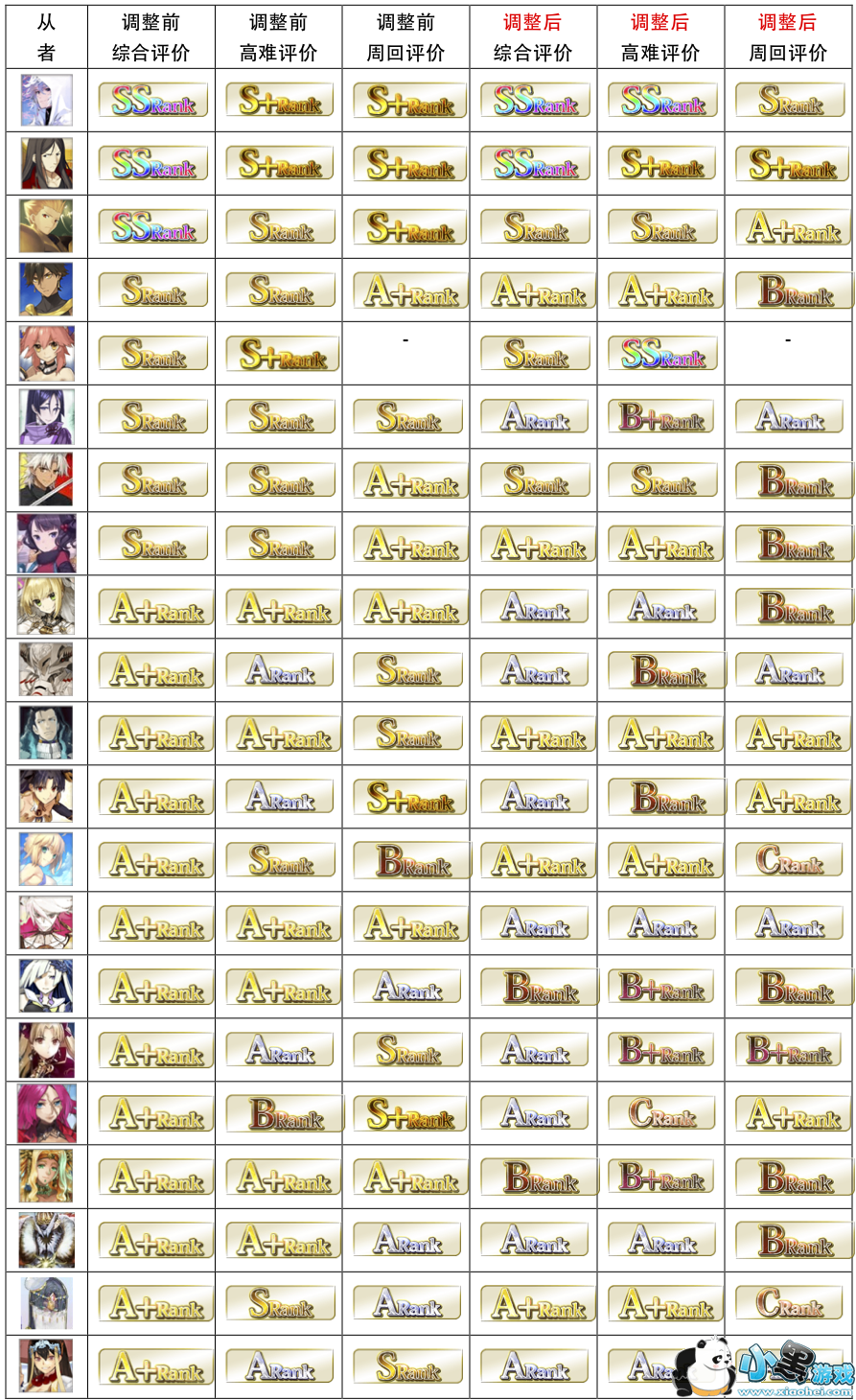 实际上,在今天最新出炉的这份节奏榜中,除了评分结果吸引眼球,评分的大幅变动也引发了热议,所以在此就以一种比较直观的方式把每位从者cba落地前后的评分变化呈现出来。细心的朋友应该能发现,之前的节奏榜里梅林的评价里第一条"代表如今FGO的从者"在这次最新的版本中已经被悄悄删掉了,所以至少就节奏榜而言可谓变天了,而真正断崖式掉分的有哪些(黑贞TAT,武藏TAT),又有哪些绿卡从者直接上天了,都能通过这张对比表格看出来。