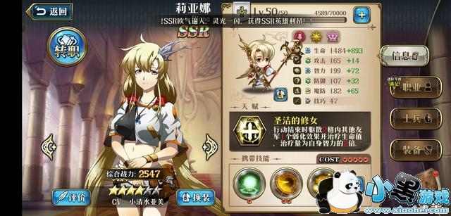 技能上除了带治疗之外,还有带有圣疗,圣疗的作用是可以群体恢复生命值,这一技能在PVE中很重要,可以起到保命的作用,因为当你的队友被群攻减血过半的时候,一个圣疗就可以恢复到满血状态,可以算是队伍中核心技能,同时莉亚娜招牌技能再动,也是必须要带的,在推图的时候也是很好用的。