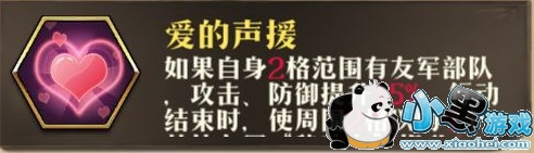 如果自身2格范围内有友军部队,攻击、防御提升15%。行动结束时,使周围2格以内的4个其他友军“移动力”提升1,持续1回合。