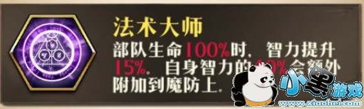 部队生命100%时,智力提升15%,自身智力的40%会额外加到魔防上。