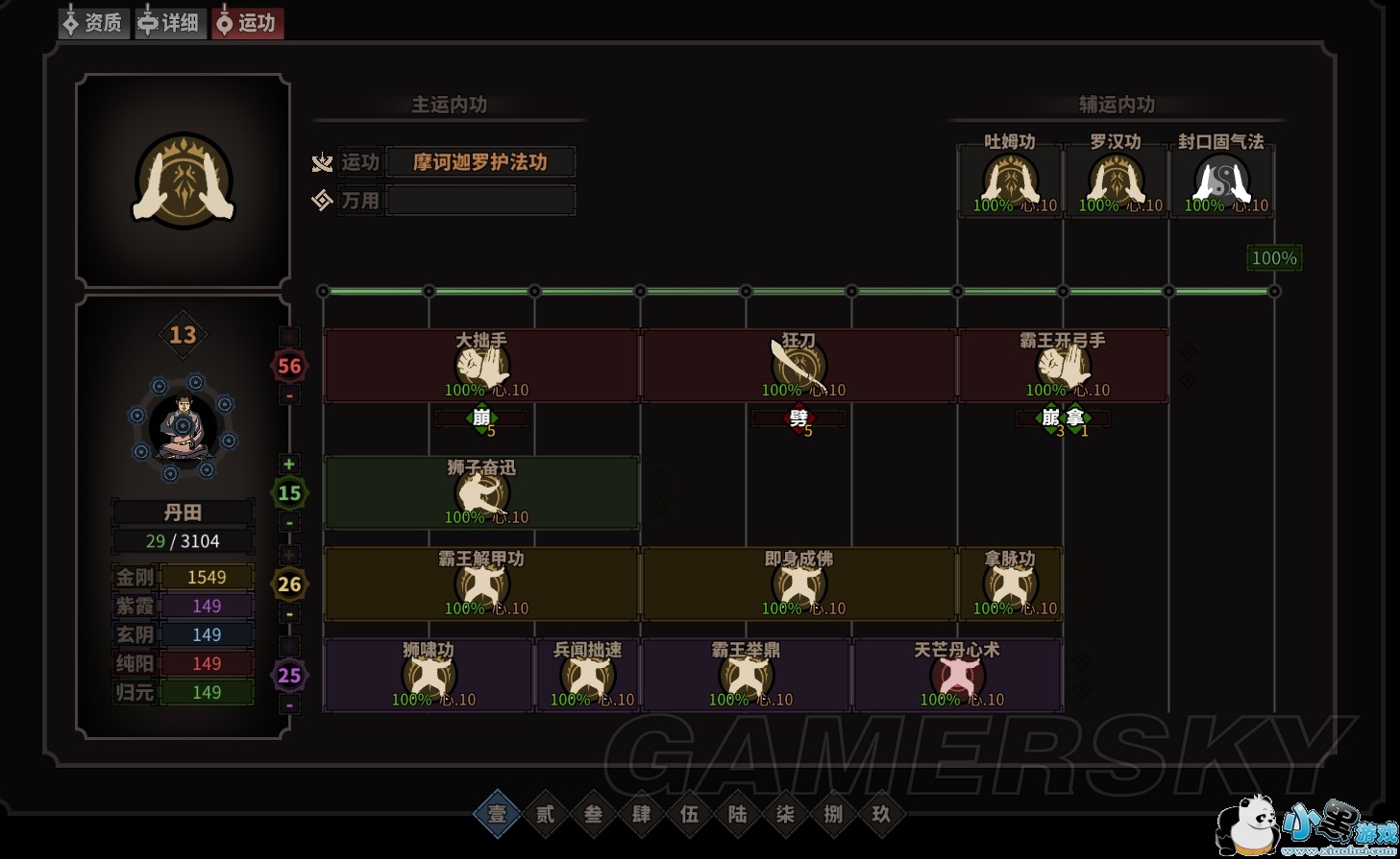先介绍装备。这里武器我选择了玄铁拳套,因为玄铁拳套拥有最大的95%力道加成。镇楼图的拳套是个半成品,理想化的玄铁拳套应该是锋锐特性+95%力道加成,精制的话看个人喜好,可以全加破体或者破甲。防具方面我也是全部选择玄铁系,因为它们能带来极高力道加成,如果能附带+20%膂力的效果那是最好了。至于防具的金装啊,震气啊等等特性这里就不强求了。宝物方面尽量选择拳掌加成膂力加成,这个不必多说。