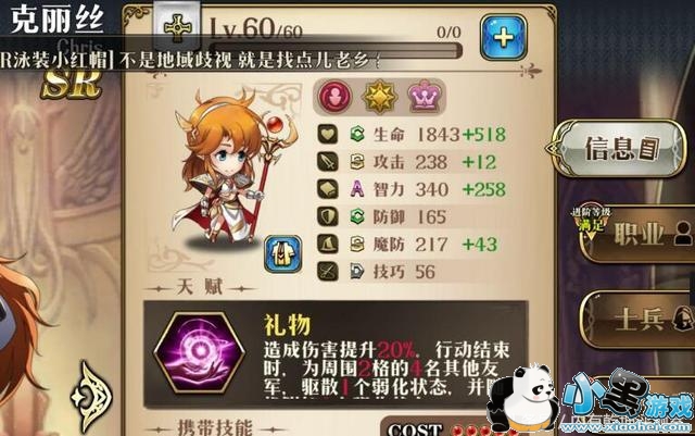 天赋方面,克里斯的增伤20%非常不错,清负面和随机强化也是一把利器。近战法师的设定让克里斯可以非常好的针对近战敌人,并且还能回复。