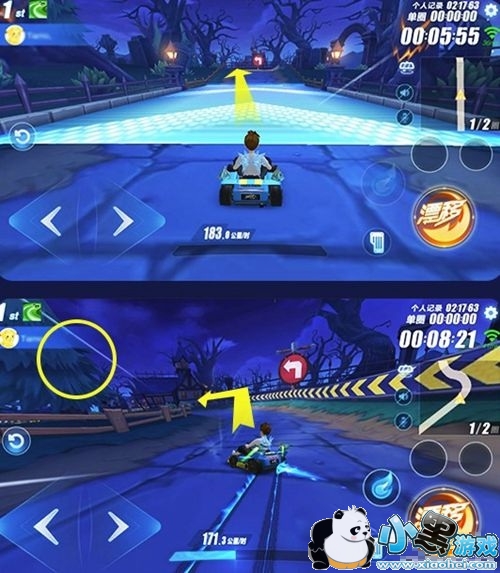 美起步接断位双喷并小漂,集满一管氮气后踩上加速带,由于起步弯道前的高低差地形会获得空喷及落地喷,使赛车从加速带下来后车速非常高,建议在到达图中大树位置时不使用最后一个落地喷,直接甩尾漂移+CWW喷出弯到达下个弯道。