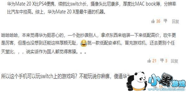 平心而论华为手机确实好用,性价比也比较高,你要是拿个iPhone来做个比较,广大网友也能理解,可是发布个手机还跨领域去跟拿游戏机界大佬任天堂去比较,是不是有点上头了?直接被网友调侃为全世界最牛逼的机器:“华为Mate 20 X比PS4便携,续航比switch长,摄像头比尼康多,厚度比MAC book薄,分辨率比汽车中控高。综上,华为Mate 20 X是最牛逼的机器。”
