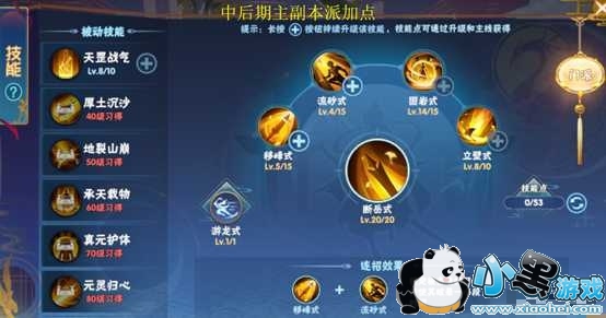 中期:25-35级,技能点越发紧张,加点优先顺序[天罡战气]>[断岳式]>[流砂式];适度加点[立壁式]提升生存能力,1级[固岩式],如有剩余的点数才点[移峰式]。
