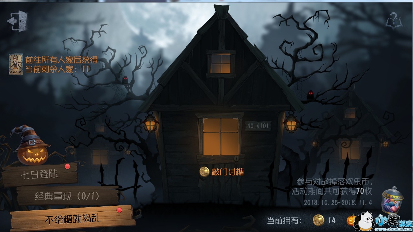 活动期间参与每日对战,即可获得万圣节欢乐币。每消耗5枚万圣节欢乐币可以参与一次不给糖果就捣乱活动。每次敲门可以获得一次随机奖励(包括线索、碎片、万圣节南瓜)。参与14次敲门更可以获得万圣节限定独特品质时装。