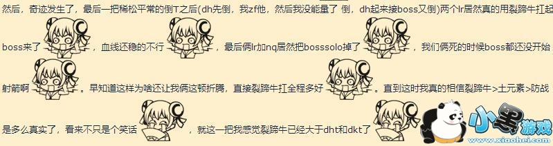 结果令人更加心碎的操作出现了,2个T居然还是扛不住BOSS巨大的输出,五人小队在寒冷的诸王本里瑟瑟发抖,只能无数次头铁地去尝试(期间裂蹄牛一直没有登场),结果在一次稀松平常的倒T之后(DKT+DH双双毙命),被坑得满脸黑线猎人终于放出了心爱的裂蹄牛,结果奇迹发生了:两头裂蹄牛居然稳稳地扛住了BOSS,俩猎人+一个奶骑,加上两个躺尸的主副T居然就这么通关了尾王。