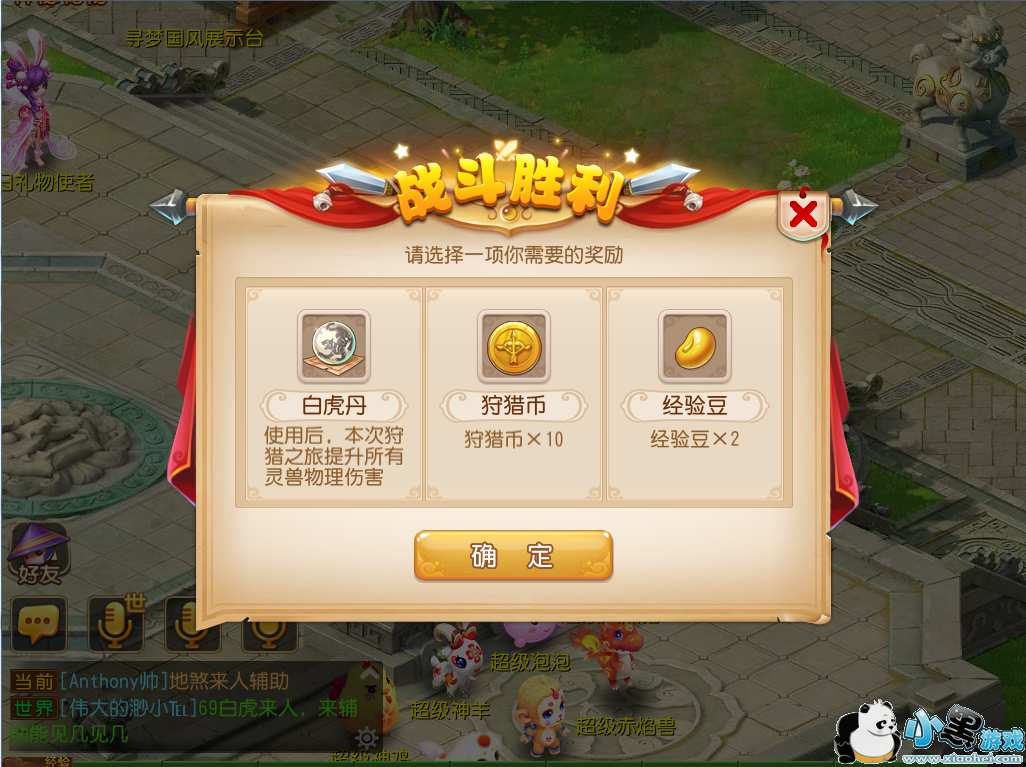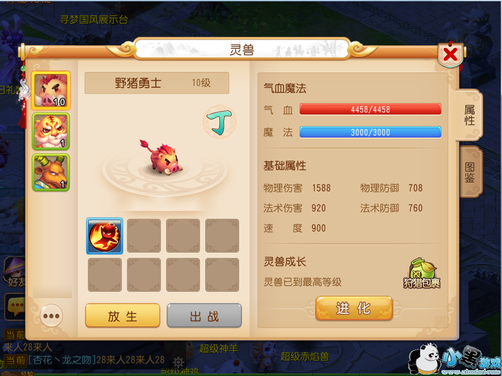 首次与狩猎大师对话,获赠10个经验豆+10个捕兽绳+3个丁级灵兽(虎+猪+羊)。建议优先使用10个经验豆把一只灵兽升到10级,然后分解6个捕兽绳获得30个狩猎币然后购买进化石,进化到丙级。至于选择哪只灵兽升级进化,可以根据自己的喜好,没有固定答案。