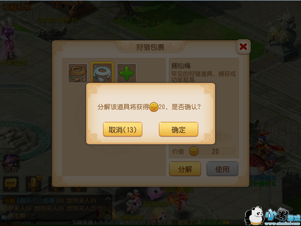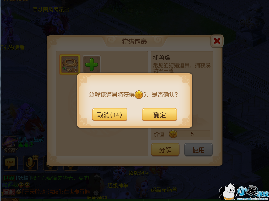 有时候在场景中,我们会遇到特殊事件—土地公公,当询问要金绳子(大概率得乌金绳)还是草绳子(随机得捕兽绳或捆仙绳)时,可以考虑博下运气选择草绳子。从性价比上看,乌金绳分解得10个狩猎币,而捆仙绳得20个,捕兽绳是5个;从作用性看,捆仙绳可捕捉所有灵兽(包括灵兽BOSS),成功率最高。