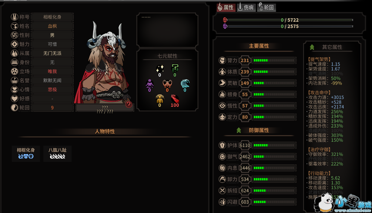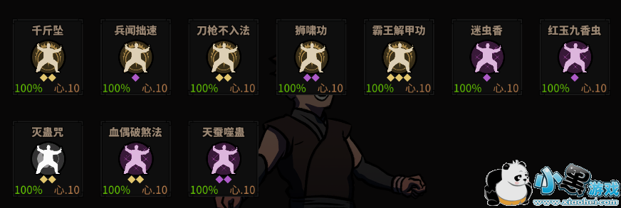 主运金刚内功,轻功一般。绝技方面兵闻拙速、狮吼功增加自身速度,迷香虫、红玉九香虫、天蚕噬蛊提升毒的伤害。金刚系的刀法威力高,需要小心被秒。技能伤害危险度 刀法>鞭法>指法。作为剑冢三大莽夫之一,血枫试图补足莽夫腿短的问题,于是换上一身木甲和一套全木质的武器,然而并没有什么卵用,选择的三个身法勉强能看,根本不足以委以重任。而后又偷学紫霞系的武功,试图玩毒爆流,但是你不知道金刚克紫霞吗?我都看到你紫霞的功法威力减10%了。玩毒爆起码带个驱血法把,然而他也没有。作为莽夫按道理生存能力要好一点把,然而一个生存技能也没有,还主动暴气(霸王卸甲功)。卸力、拆招、闪避属性低的可怜,仿佛在说大家尽管往我身上打,我全都接着不碍事。要不是有半血被动减一下,估计一招内伤技能就能带走,真是莽夫界的耻辱啊。