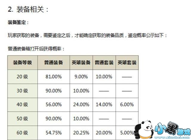 装备宝箱打开后的装备也存在概率,英雄套装的只存在与40级与60级,出现几率分别为6%与5%。