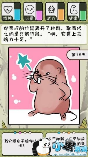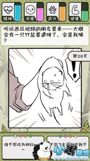 玩家扮演的竹鼠每天都有两个不同的选择,无论是积极或是消极,选择上的点将会影响到你未来的进展,某一个数值(精神、可爱、武力、健康)过高或过低也可能造成你被抓的原因,该如何维持数值保持在一定以上就是你需要做的事情,同样的你也不能让你的竹鼠过胖,否则也可能会让自己变成农家兄弟的餐点。