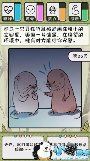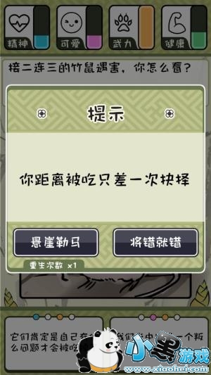 每当达成一个结局成就后,部分结局在下次开始游戏将会帮玩家增强一定的属性,但这些属性并不会累加,想要活得更久就得步步为营,每天的问题非常的多样化,谨慎小心的选择才是其中的生存之道。在结局中也能看到各式各样吃竹鼠的理由,是否能够晚点才变成肚中餐,就得靠玩家的努力萝。